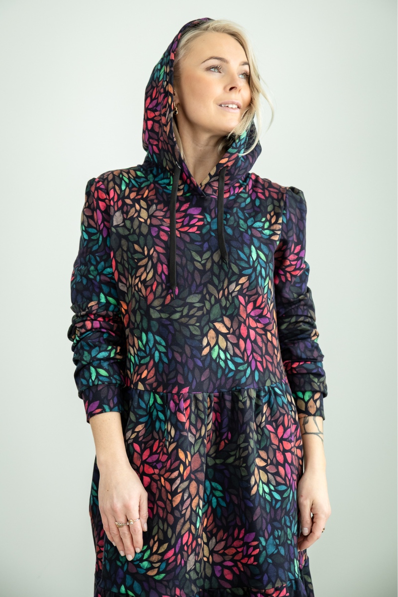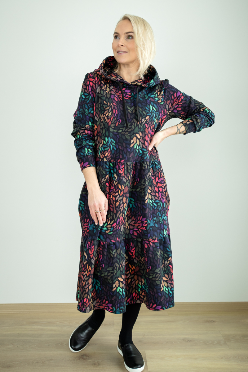 Atviro kirpimo ilgesnė figūrą primenanti suknelė su kišenėmis ir gobtuvu Helen Colours Play-Dress sandėlyje XL likę vienetų