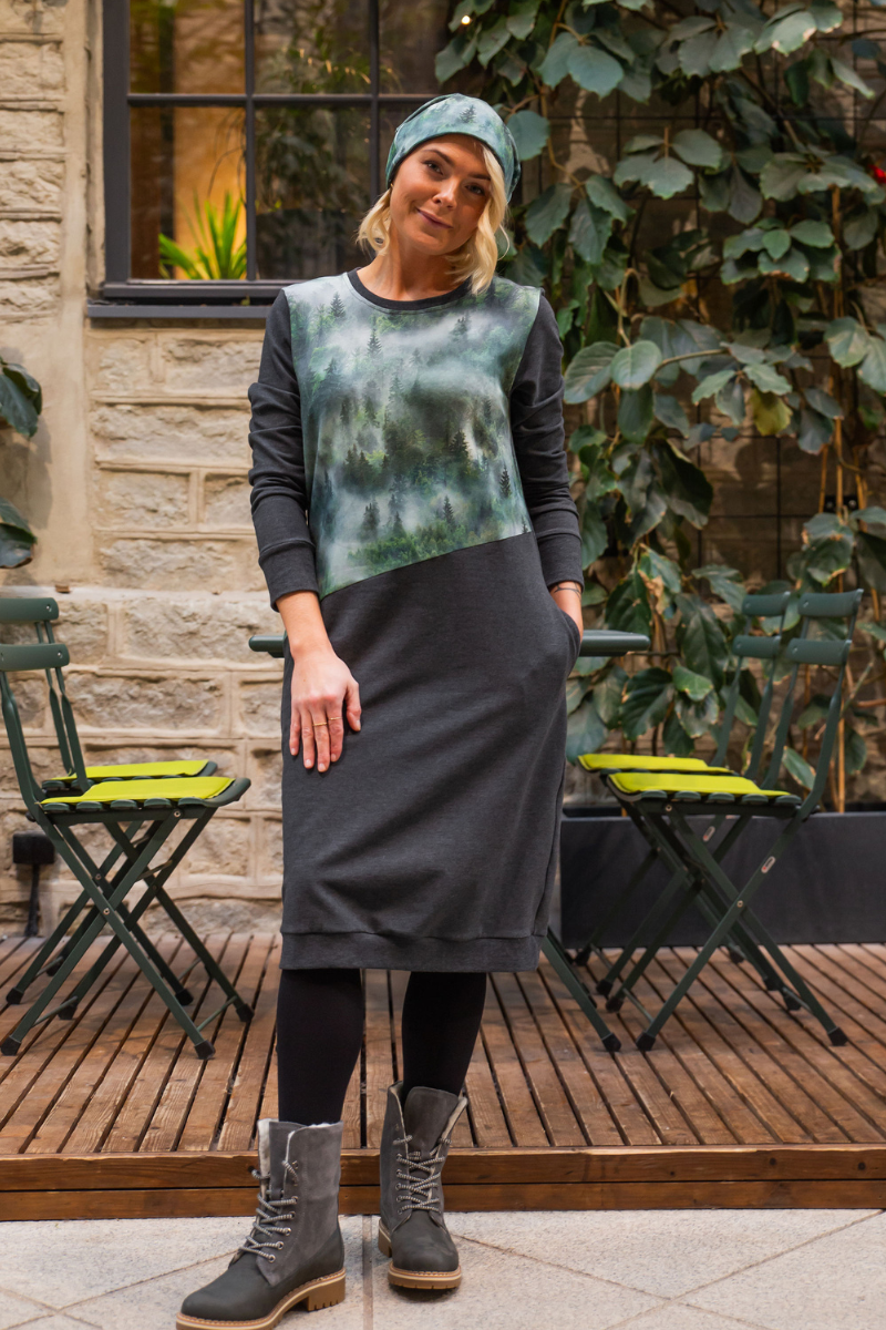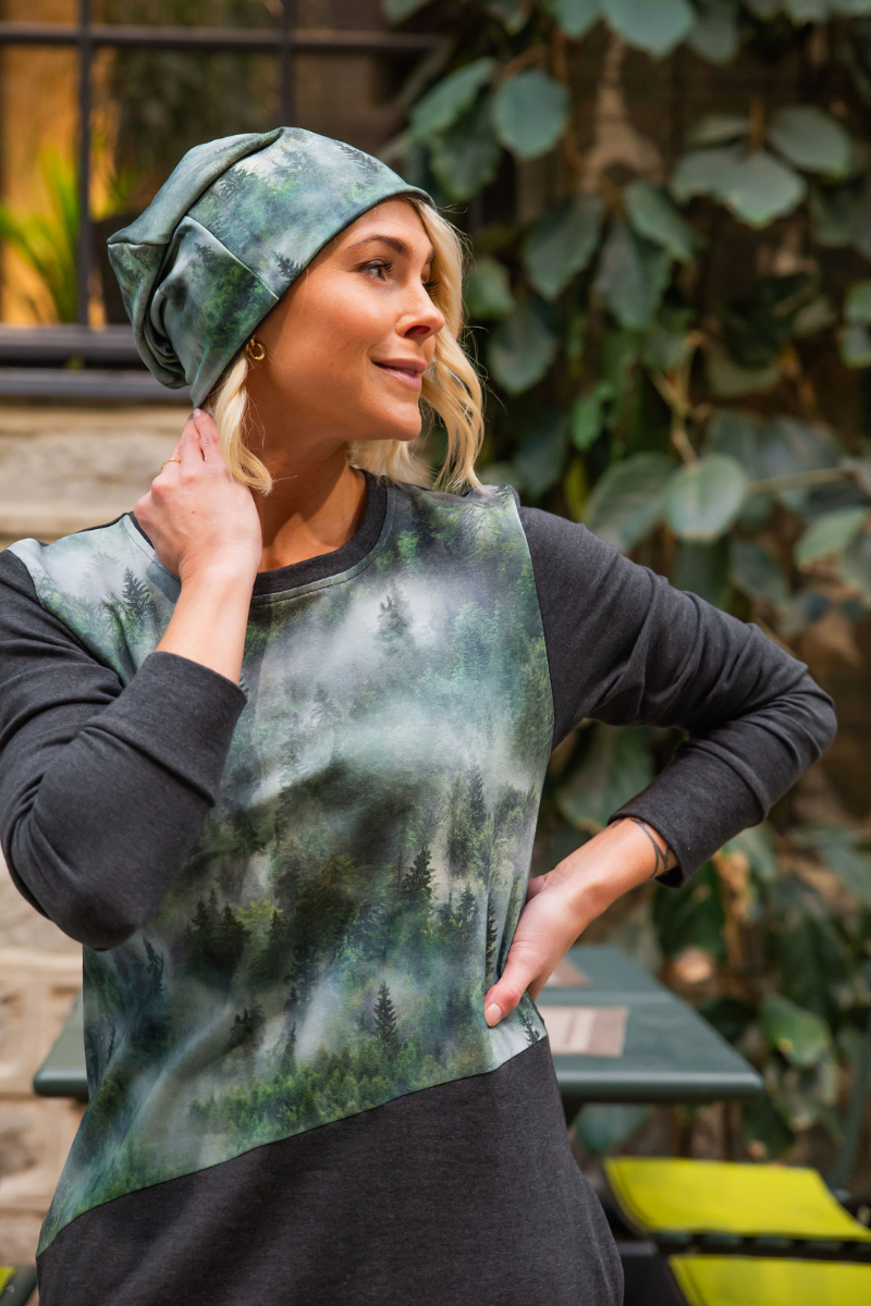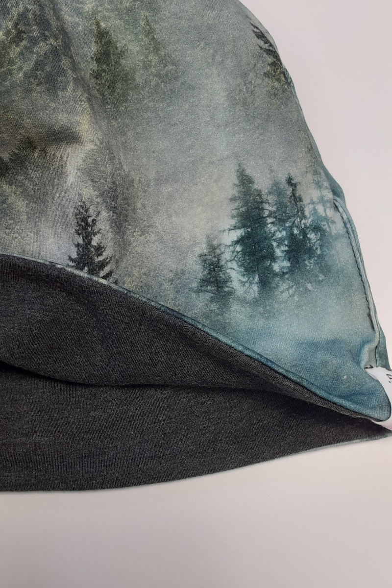 Dviejų dalių medvilninio audinio kepurė Sleepy Forest (1 pusė tamsiai pilka, o kita pusė su miško piešiniu) – beveik sandėlyje – pristatome per kelias dienas.