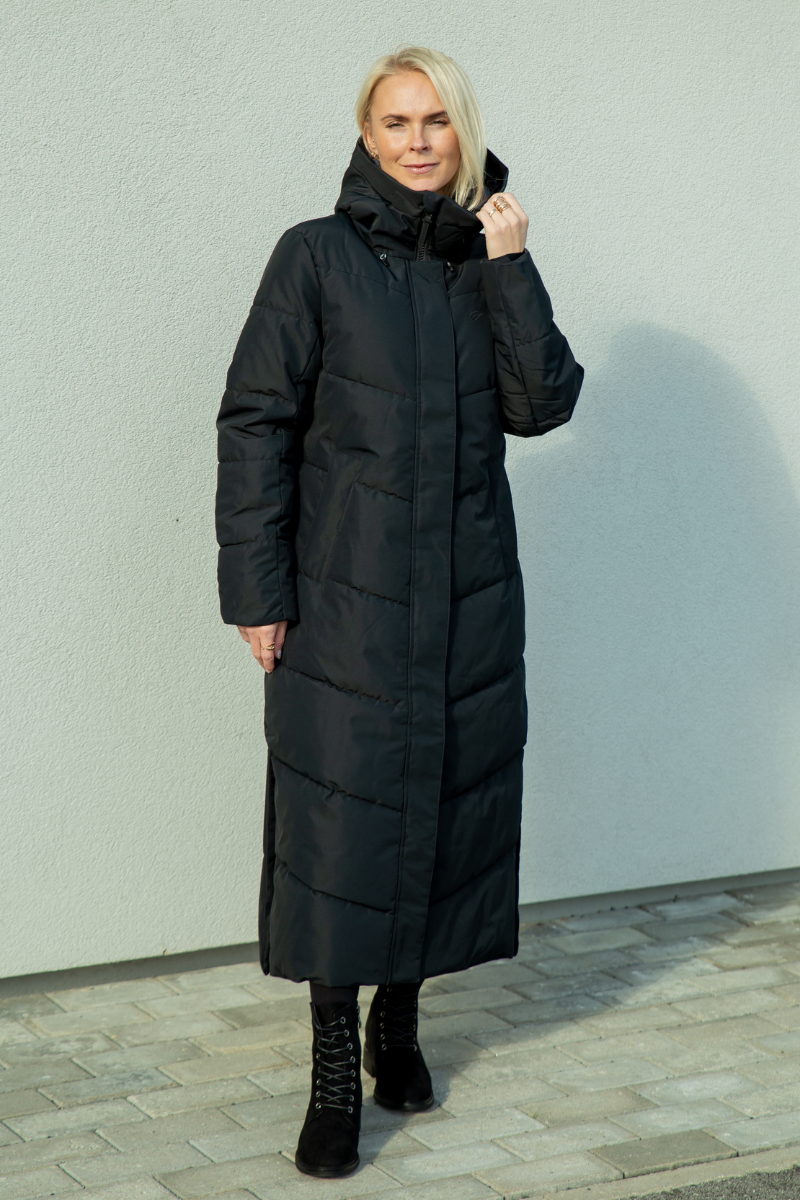 Šiltas ir moteriškas rudens-žiemos sezonui skirtas moteriško liemens kirpimo žieminis paltas – klasikinės juodos spalvos paltą lengva derinti prie įvairių drabužių.