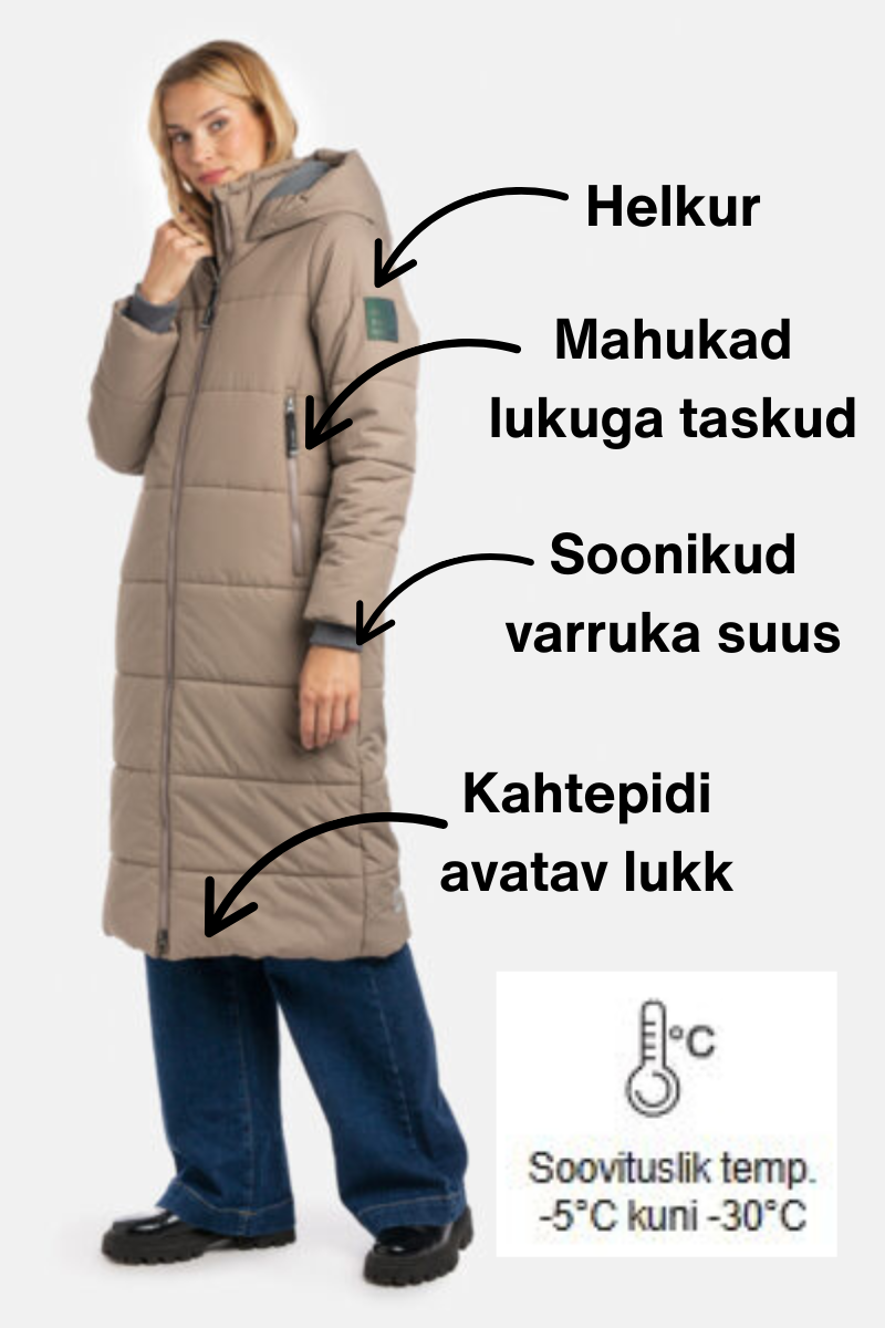 “Huppa Nina” žieminis paltas yra puikus pasirinkimas moterims, ieškančioms ilgesnio ir itin šilto žieminio palto, kuris apsaugotų nuo vėjo, lietaus ir šalčio. Šis paltas pritaikytas šaltiems ir nepastoviems Estijos orams – puikiai tinka kasdieniam nešiojimui arba iškilmingesnėms progoms su sijonu ar suknele.
