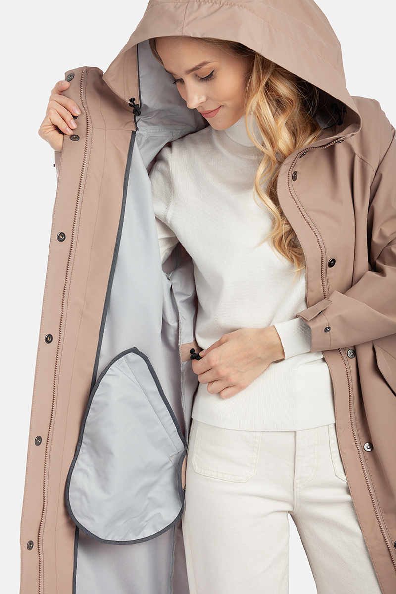 Šis vandeniui ir vėjui atsparus moteriškas paltas puikiai tinka dėvėti pavasarį, vasarą ir rudenį. Audinys pralaidus orui, lengvas ir atsparus UV spinduliams.