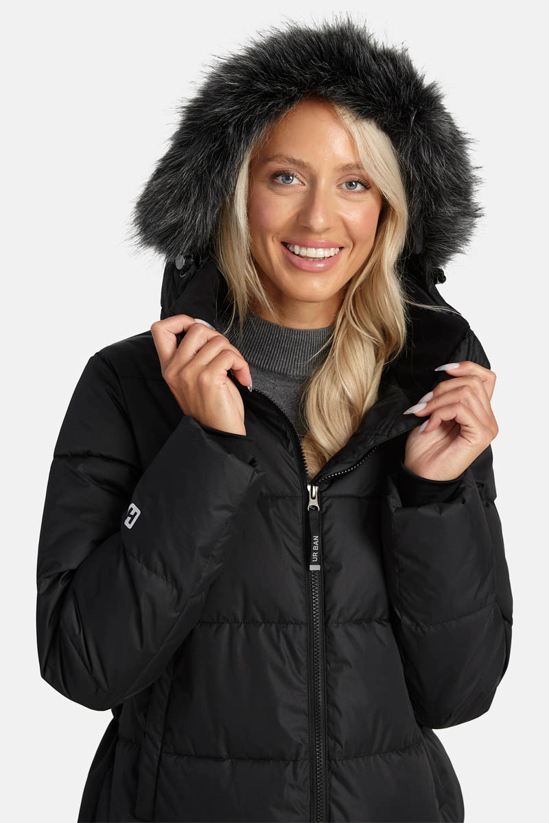 Praktiškos detalės – užtrauktuku užsegamos priekinės kišenės, šviesą atspindinčios detalės, nuimamas gobtuvas ir dirbtinio kailio gobtuvo apačia.