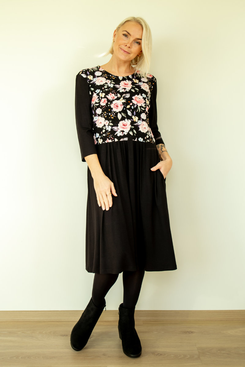 Stilinga juoda palaidinė suknelė su kišenėmis Rudens gėlės-Kohe sandėlyje paskutinis dydis M(38-40)