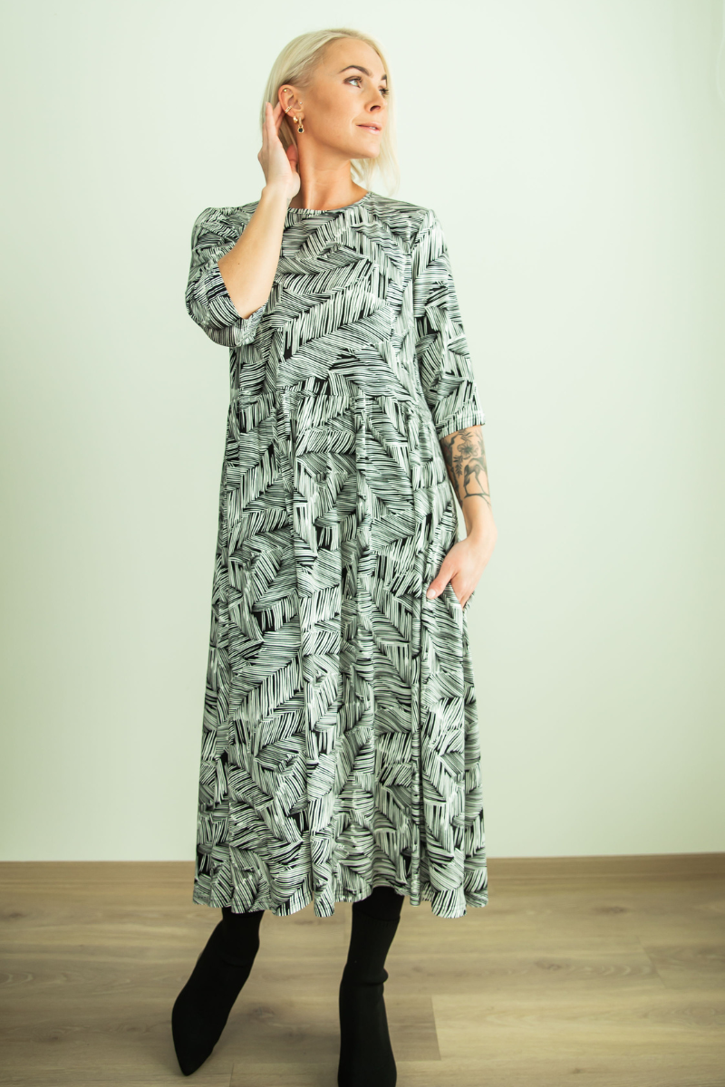 Miela juodai balta raštuota ilga suknelė su figūrą išryškinančiomis kišenėmis “Nelli” – beveik sandėlyje naujausias dydis L(42-44)