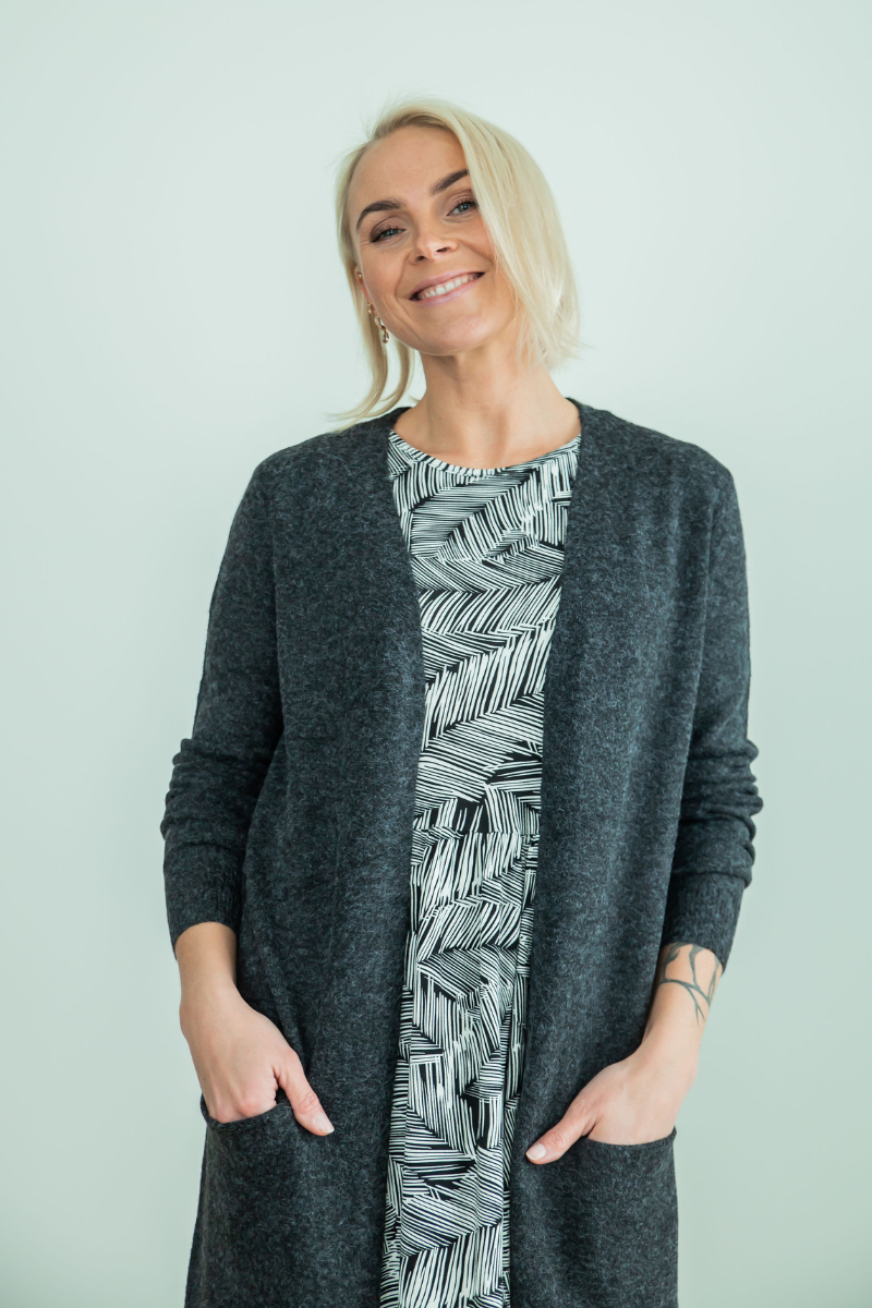 Prie suknelės priderinome “Vero Moda” megztinį su švarkeliu “Doffy”, kurį rasite čia https://www.stiilne.ee/toode/vero-moda-naiste-kampsun-doffy-must/.