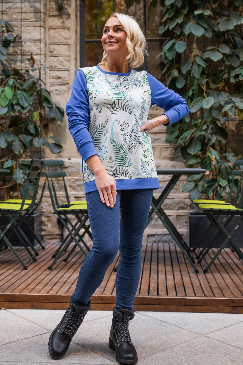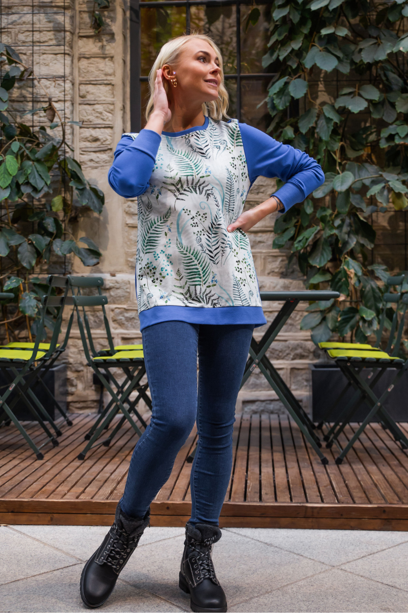 Ilgesnė palaidinė su kišenėmis ir plataus kirpimo vidutinio mėlynumo raštu