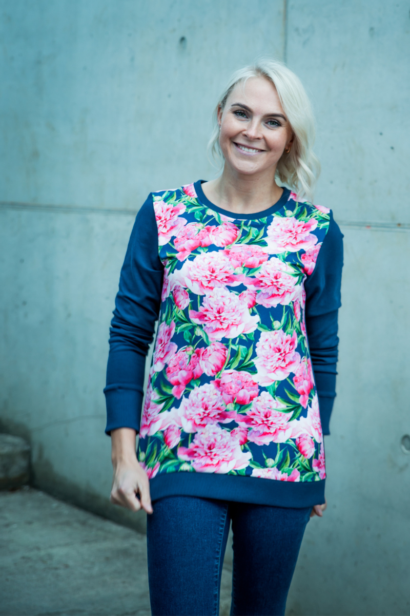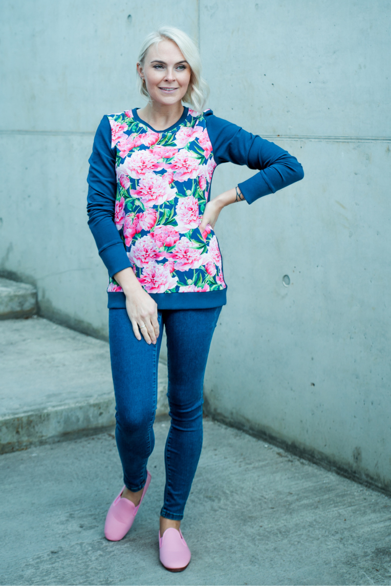 Mielos benzino mėlynos spalvos palaidinukė su Trefoil gėlėmis pagal pareikalavimą