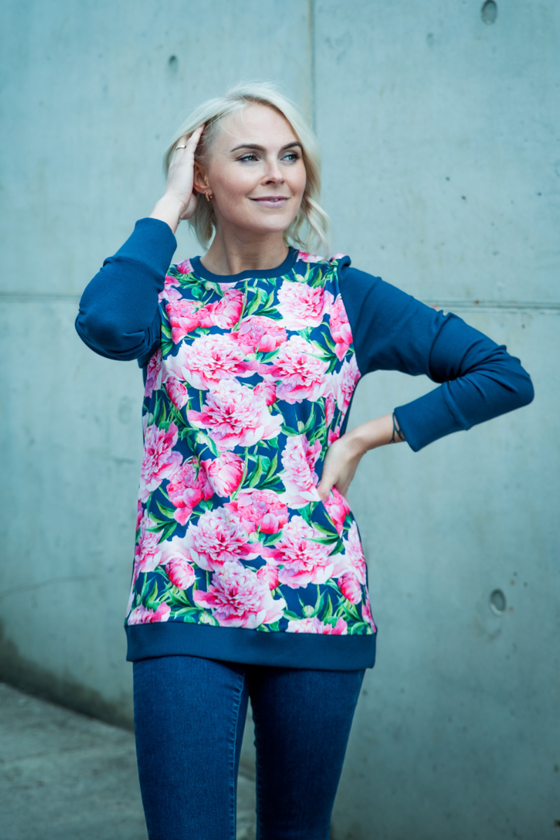 Ilgesnė palaidinė su kišenėmis ir plataus kirpimo Azalijos gėlės