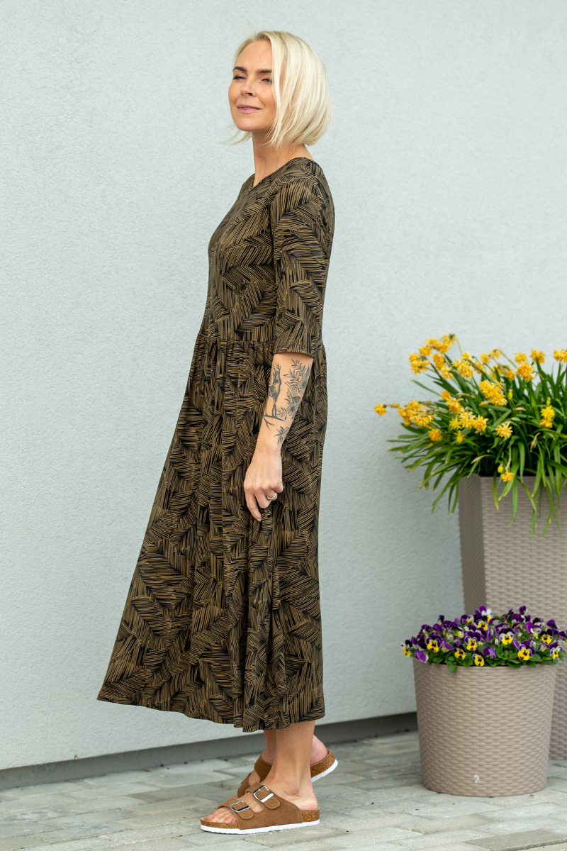 Miela žalių lapų rašto suknelė aukštomis rankovėmis su kišenėmis Nelli – sandėlyje yra M, L ir XL