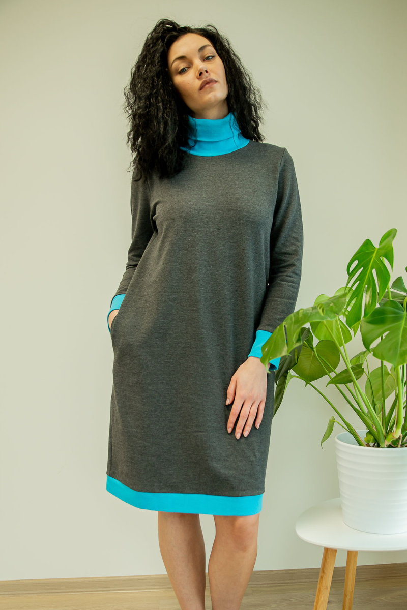 Patogi tamsiai pilkos spalvos palaidinė suknelė su mėlynos spalvos kišenėmis ir aukštu kaklu – beveik sandėlyje M(38-40) dydis – DIDELĖ KAINA