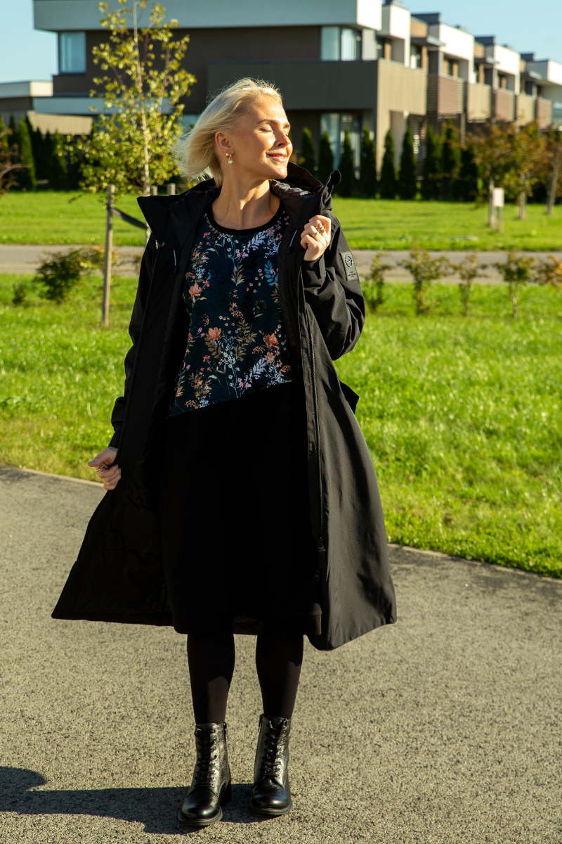 Su šia suknele jausitės gerai, nes medžiaga pakankamai šilta, suknelė yra gero ilgio (daugumai moterų jos ilgis siekia kelius) ir ją galima dėvėti visais keturiais Estijos metų laikais.Šaltuoju metų laiku po suknele tiesiog mūvėkite šiltas pėdkelnes.
