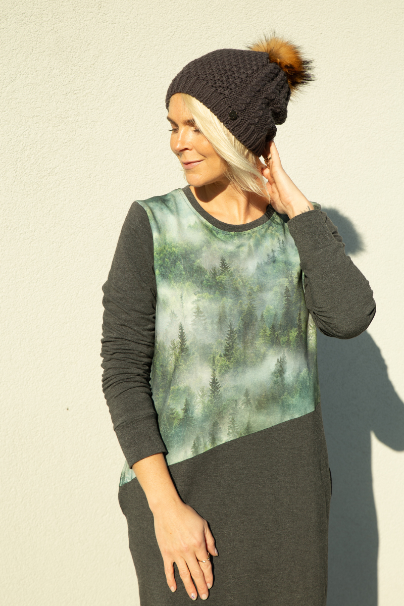 Atviro kirpimo ilgesnė figūrą primenanti suknelė su kišenėmis ir gobtuvu Helen Colours Play-Dress sandėlyje XL likę vienetų