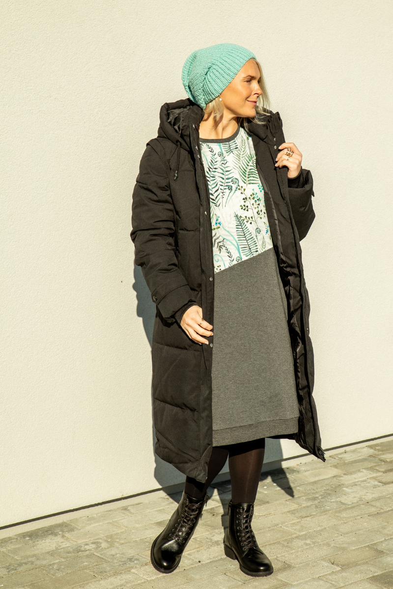Ilgesnė figūrą primenanti suknelė su kišenėmis ir gobtuvu Helen Rabamets-Kohe, sandėlyje yra XL dydžio