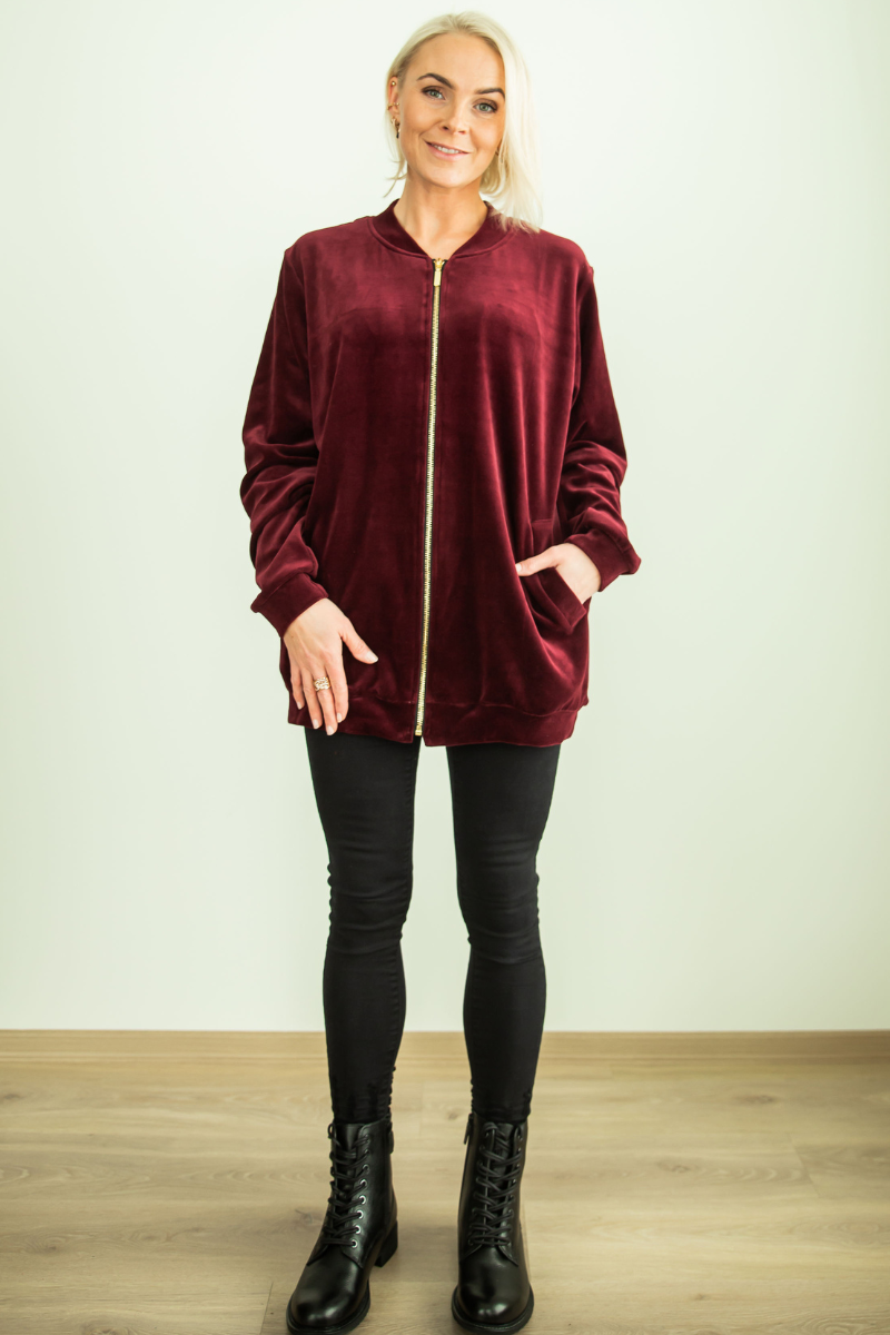 Stilingas minkšto aksomo audinio bomber stiliaus švarkas Bordo raudonos spalvos – NAUDOJAMAS XL dydžio (44-46)